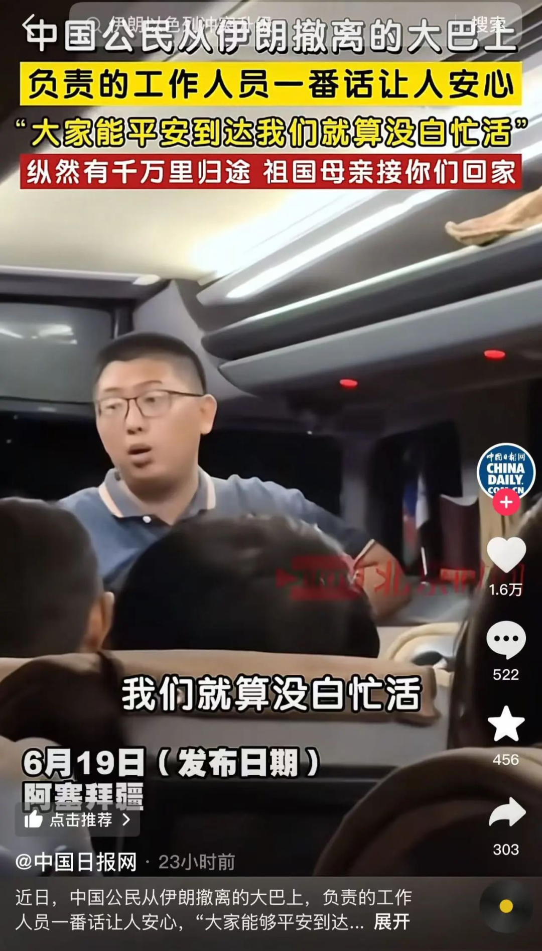 在撤离过程中,使馆工作人员在大巴内的一段发言,令人动容: